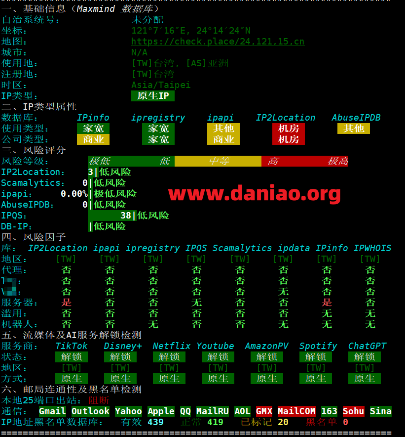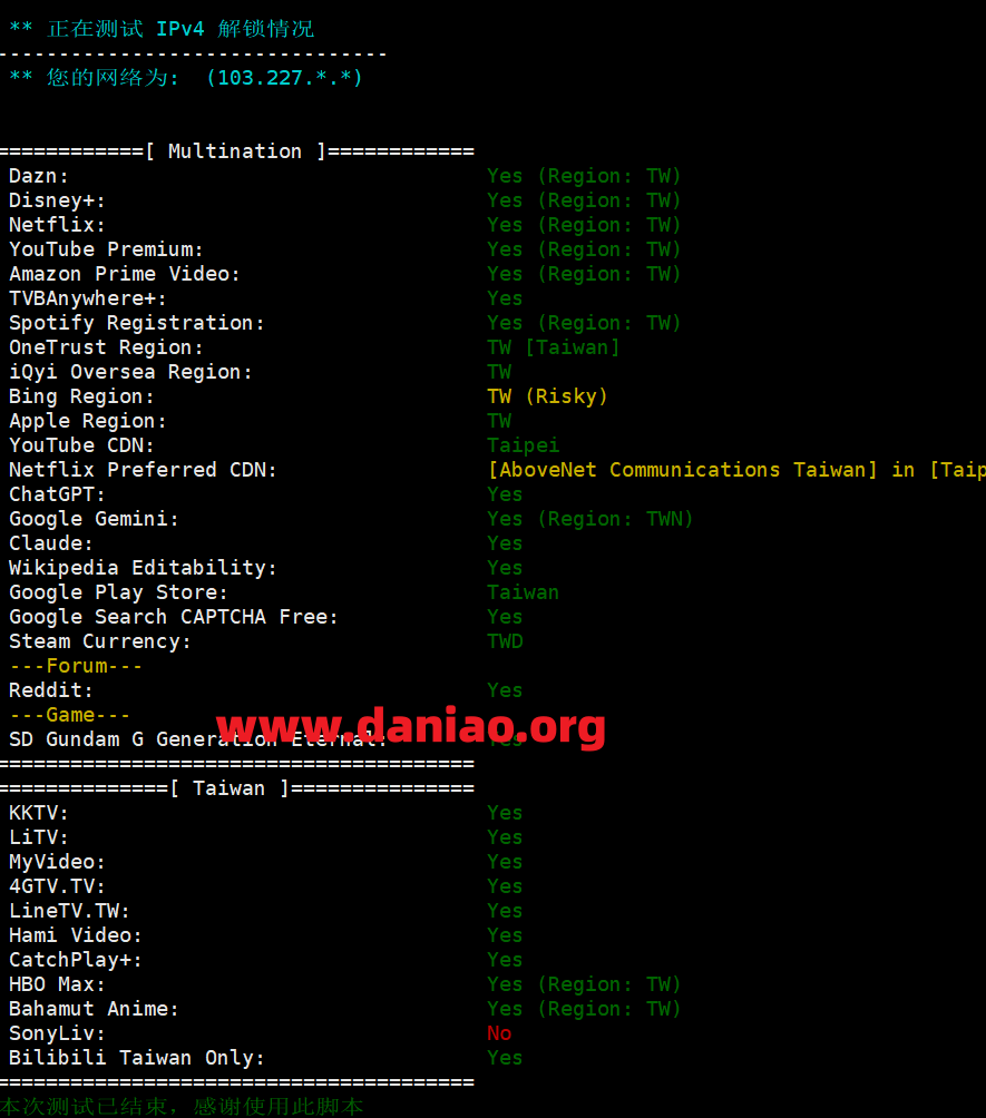 IP为台湾原生IP,ipinfo和 ipregistry测试为ISP属性,IP解锁优秀,基本上是全解锁了。