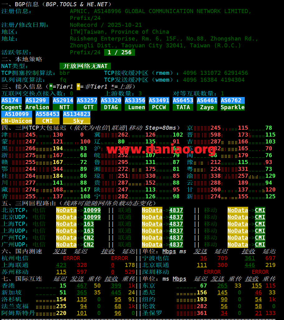 五、三网回程路由(线路可能随网络负载动态变化) 北京TCP:电信 NoData->10099 || 联通 NoData->4837 || 移动 NoData->CMI 北京UDP:电信 NoData->10099 || 联通 NoData->4837 || 移动 NoData->CMI 上海TCP:电信 NoData->163 || 联通 NoData->4837 || 移动 NoData->CMI 上海UDP:电信 NoData->163 || 联通 NoData->4837 || 移动 NoData->CMI 广州TCP:电信 NoData->CN2 || 联通 NoData->4837 || 移动 NoData->CMI 广州UDP:电信 NoData->CN2 || 联通 NoData->4837 || 移动 NoData->CMI