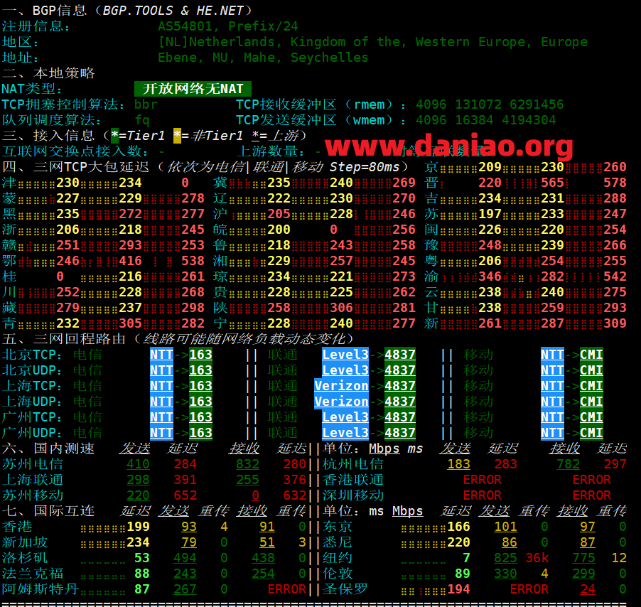 五、三网回程路由(线路可能随网络负载动态变化) 北京TCP:电信 NTT->163 || 联通 Level3->4837 || 移动 NTT->CMI 北京UDP:电信 NTT->163 || 联通 Level3->4837 || 移动 NTT->CMI 上海TCP:电信 NTT->163 || 联通 Verizon->4837 || 移动 NTT->CMI 上海UDP:电信 NTT->163 || 联通 Verizon->4837 || 移动 NTT->CMI 广州TCP:电信 NTT->163 || 联通 Level3->4837 || 移动 NTT->CMI 广州UDP:电信 NTT->163 || 联通 Level3->4837 || 移动 NTT->CMI