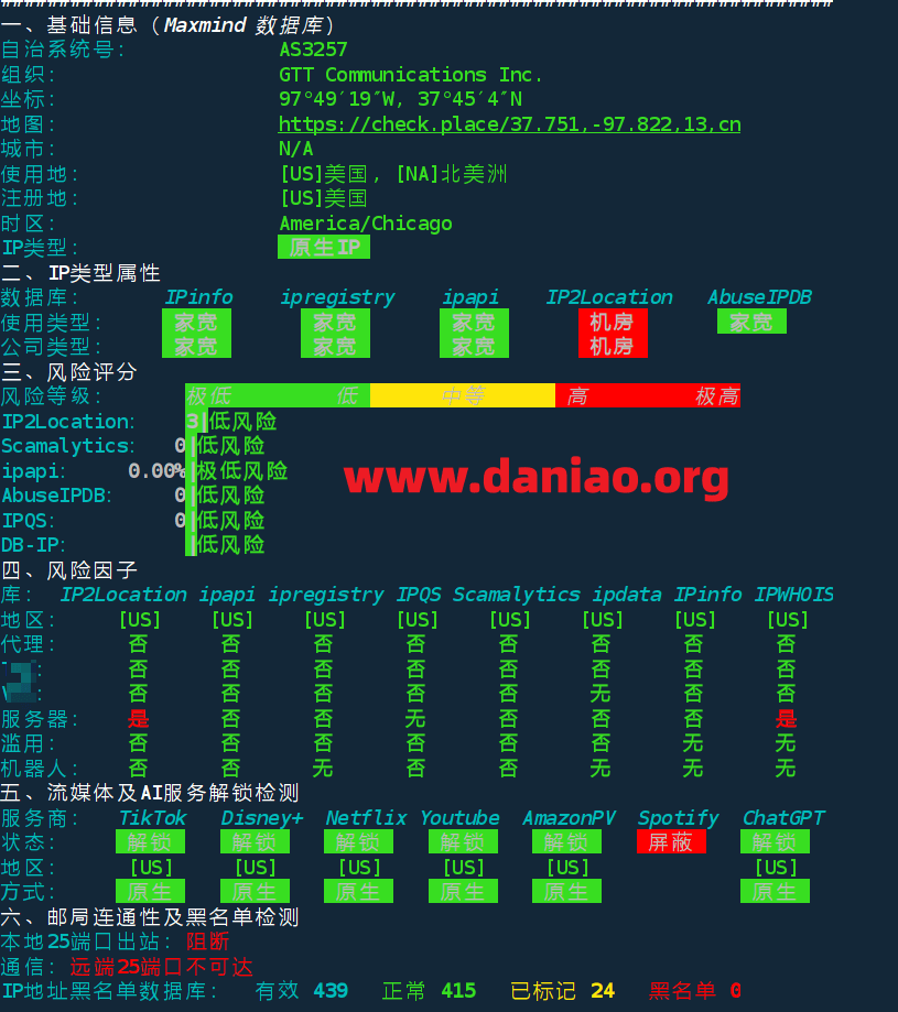 IP质量:美国原生IP,多个数据库显示为ISP属性。