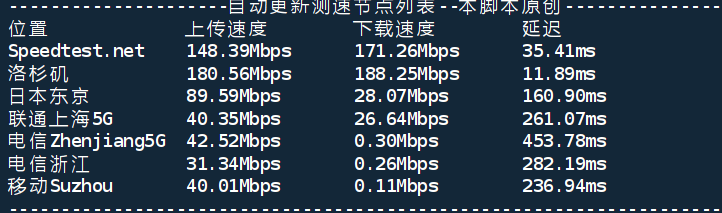 iperf3 Network Speed Tests (IPv4): --------------------------------- Provider | Location (Link) | Send Speed | Recv Speed | Ping ----- | ----- | ---- | ---- | ---- Clouvider | London, UK (10G) | 175 Mbits/sec | 158 Mbits/sec | 124 ms Eranium | Amsterdam, NL (100G) | 174 Mbits/sec | 178 Mbits/sec | 136 ms Uztelecom | Tashkent, UZ (10G) | 160 Mbits/sec | 132 Mbits/sec | 223 ms Leaseweb | Singapore, SG (10G) | 166 Mbits/sec | 160 Mbits/sec | -- Clouvider | Los Angeles, CA, US (10G) | 190 Mbits/sec | 189 Mbits/sec | 0.510 ms Leaseweb | NYC, NY, US (10G) | 182 Mbits/sec | 183 Mbits/sec | 60.8 ms Edgoo | Sao Paulo, BR (1G) | 161 Mbits/sec | 110 Mbits/sec | 216 ms