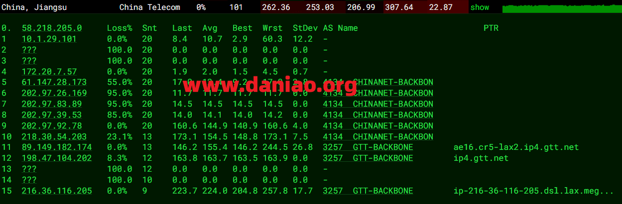 电信去程:电信骨干线路直连美西洛杉矶之后接驳GTT回机房