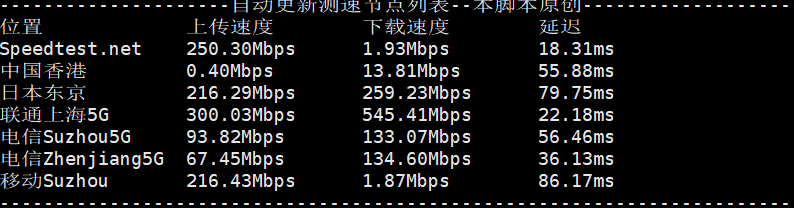 Node Name Upload Speed Download Speed Latency Packet Loss Speedtest.net 305.42 Mbit/s 1.77 Mbit/s 18.31 ms 0.0% Zhenjiang 5G CT 249.56 Mbit/s 769.02 Mbit/s 34.85 ms Not available Shanghai 5G CU 306.79 Mbit/s 765.50 Mbit/s 21.66 ms Not available ---------------------------------------------------------------------------------- Node Name Upload Speed Download Speed Latency Packet Loss Hong Kong CN 310.56 Mbit/s 546.27 Mbit/s 30.37 ms 0.0% Taiwan CN 303.72 Mbit/s 763.64 Mbit/s 60.69 ms 0.0% Tokyo JP 175.51 Mbit/s 668.46 Mbit/s 336.50 ms 0.3% Los Angeles US 193.96 Mbit/s 0.57 Mbit/s 289.84 ms 0.0% London UK 247.57 Mbit/s 4.48 Mbit/s 231.76 ms 0.0% France FR 257.41 Mbit/s 0.79 Mbit/s 638.07 ms 0.0%