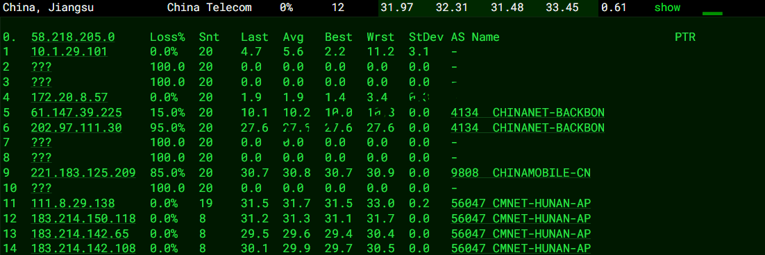 | 中国电信 | 湖南长沙电信 12ms | 新疆乌鲁木齐电信 64ms | 30ms |