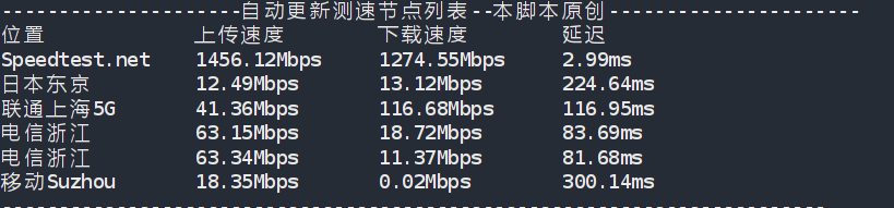 iperf3 Network Speed Tests (IPv4): --------------------------------- Provider | Location (Link) | Send Speed | Recv Speed | Ping ----- | ----- | ---- | ---- | ---- Clouvider | London, UK (10G) | 743 Mbits/sec | 584 Mbits/sec | 167 ms Eranium | Amsterdam, NL (100G) | 488 Mbits/sec | 378 Mbits/sec | 239 ms Uztelecom | Tashkent, UZ (10G) | 912 Mbits/sec | 390 Mbits/sec | 260 ms Leaseweb | Singapore, SG (10G) | 2.84 Gbits/sec | 191 Mbits/sec | 48.9 ms Clouvider | Los Angeles, CA, US (10G) | busy | 490 Mbits/sec | 205 ms Leaseweb | NYC, NY, US (10G) | busy | 418 Mbits/sec | 241 ms Edgoo | Sao Paulo, BR (1G) | busy | 238 Mbits/sec | 373 ms iperf3 Network Speed Tests (IPv6): --------------------------------- Provider | Location (Link) | Send Speed | Recv Speed | Ping ----- | ----- | ---- | ---- | ---- Clouvider | London, UK (10G) | 728 Mbits/sec | 575 Mbits/sec | 164 ms Eranium | Amsterdam, NL (100G) | 491 Mbits/sec | 376 Mbits/sec | 236 ms Uztelecom | Tashkent, UZ (10G) | 453 Mbits/sec | 396 Mbits/sec | 257 ms Leaseweb | Singapore, SG (10G) | 2.82 Gbits/sec | 180 Mbits/sec | 45.6 ms Clouvider | Los Angeles, CA, US (10G) | busy | busy | 200 ms Leaseweb | NYC, NY, US (10G) | 491 Mbits/sec | 326 Mbits/sec | 238 ms Edgoo | Sao Paulo, BR (1G) | busy | 211 Mbits/sec | 371 ms