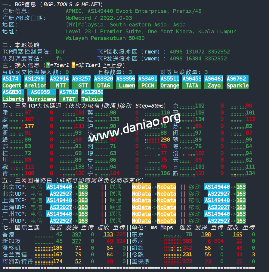 Evoxt有马来西亚优化线路(CN2 GIA+10099)云服务器,东南亚优化线路较少,之前大鸟笔记也测评过电信走CN2 GIA,联通走AS9929,这简直是传家宝级别的线路。CPU给的是 AMD EPYC-Genoa,虽然内存不大,但是单核性能很强,Geekbench和Sysbench跑分都很顶。最低配RAM: 512MB (实际可用 457MB),为了防止大家踩坑,特意跑了个详细测评,感兴趣的童鞋可以围观~~