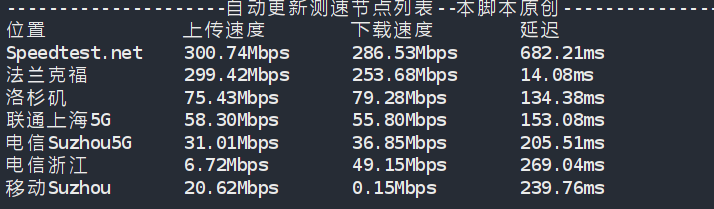 ---------------------------------------------------------------------- CPU Model : AMD EPYC-Rome Processor CPU Cores : 2 @ 2799.998 MHz CPU Cache : 512 KB AES-NI : ✓ Enabled VM-x/AMD-V : ✗ Disabled Total Disk : 20.1 GB (1.8 GB Used) Total Mem : 1.9 GB (249.8 MB Used) Total Swap : 512.0 MB (524.0 KB Used) System uptime : 0 days, 3 hour 3 min Load average : 0.02, 0.03, 0.01 OS : Debian GNU/Linux 13 Arch : x86_64 (64 Bit) Kernel : 6.12.38+deb13-amd64 TCP CC : bbr Virtualization : KVM IPv4/IPv6 : ✓ Online / ✗ Offline Organization : AS202736 WISDOM CLOUD INTERNET TECHNOLOGY PTE. LTD. Location : London / GB Region : England ---------------------------------------------------------------------- I/O Speed(1st run) : 292 MB/s I/O Speed(2nd run) : 293 MB/s I/O Speed(3rd run) : 295 MB/s I/O Speed(average) : 293.3 MB/s ---------------------------------------------------------------------- Node Name Upload Speed Download Speed Latency Speedtest.net 299.99 Mbps 287.16 Mbps 1.13 ms Paris, FR 300.49 Mbps 286.49 Mbps 11.43 ms Shanghai, CN 323.96 Mbps 284.84 Mbps 199.23 ms Hong Kong, CN 324.37 Mbps 291.03 Mbps 191.50 ms Singapore, SG 76.66 Mbps 291.09 Mbps 163.37 ms Tokyo, JP 326.92 Mbps 314.43 Mbps 219.32 ms