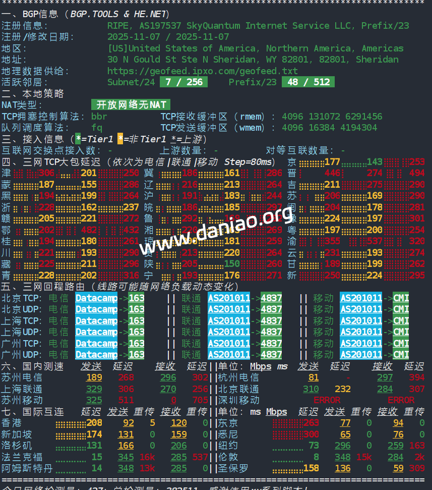 五、三网回程路由(线路可能随网络负载动态变化) 北京TCP:电信 Datacamp->163 || 联通 AS201011->4837 || 移动 AS201011->CMI 北京UDP:电信 Datacamp->163 || 联通 AS201011->4837 || 移动 AS201011->CMI 上海TCP:电信 Datacamp->163 || 联通 AS201011->4837 || 移动 AS201011->CMI 上海UDP:电信 Datacamp->163 || 联通 AS201011->4837 || 移动 AS201011->CMI 广州TCP:电信 Datacamp->163 || 联通 AS201011->4837 || 移动 AS201011->CMI 广州UDP:电信 Datacamp->163 || 联通 AS201011->4837 || 移动 AS201011->CMI