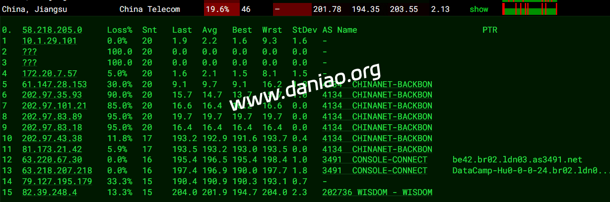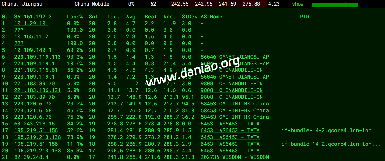 广东 电信 Datacamp -> 163 地理路径:英国 -> 荷兰 -> 香港 -> 广东 自治系统路径:AS202736 -> AS60068 -> AS4134 1 0.72ms 82.39.*.* AS202736 英国 英格兰 伦敦 wisdomisp.com 2 0.70ms 79.127.*.* * 英国 英格兰 伦敦 3 1.18ms 185.156.*.* [CDN77-PEERLINKS] * 英国 英格兰 伦敦 4 8.58ms 185.229.*.* AS60068 [CDN77-c0r3] 荷兰 北荷兰省 阿姆斯特丹 cdn77.com 5 7.38ms 79.127.*.* * 荷兰 北荷兰省 阿姆斯特丹 6 198.35ms 37.19.*.* [CDN77-int] * 荷兰 北荷兰省 阿姆斯特丹 7 182.32ms 202.97.*.* AS4134 [CHINANET-BB] 中国 香港 chinatelecom.com.cn 电信 8-9 183.58ms 202.97.*.* AS4134 [CHINANET-BB] 中国 广东 广州 chinatelecom.com.cn 12 186.34ms 113.108.*.* AS4134 [CHINANET-GD] 中国 广东省 广州市 chinatelecom.com.cn 电信 16 210.06ms 183.47.*.* AS4134 [APNIC-AP] 中国 广东省 广州市 chinatelecom.com.cn 电信 广东 联通 AS201011 -> 4837 地理路径:英国 -> 德国 -> 北京 -> 广东 自治系统路径:AS202736 -> AS201011 -> AS4837 -> AS136958 1 0.24ms 82.39.*.* AS202736 英国 英格兰 伦敦 wisdomisp.com 2-3 0.52ms 79.127.*.* * 英国 英格兰 伦敦 4 13.85ms 5.56.*.* AS201011 德国 黑森 美因河畔法兰克福 core-backbone.com 5 15.85ms 80.81.*.* AS4837 [DE-CIX] 德国 黑森 DE-CIX Frankfurt - China Unicom - 100Gbps chinaunicom.cn 6-7 186.06ms 219.158.*.* AS4837 [CU169-BACKBONE] 中国 北京 北京 chinaunicom.cn 16 219.16ms 157.148.*.* AS136958 [UNICOM-GD] 中国 广东省 广州市 chinaunicom.cn 联通 广东 移动 AS201011 -> CMI 地理路径:英国 -> 广东 自治系统路径:AS202736 -> AS201011 -> AS58453 -> AS9808 -> AS56040 1 3.13ms 82.39.*.* AS202736 英国 英格兰 伦敦 wisdomisp.com 2-3 0.58ms 79.127.*.* * 英国 英格兰 伦敦 4 1.28ms 80.255.*.* AS201011 英国 英格兰 伦敦 core-backbone.com 6 2.85ms 223.120.*.* AS58453 [CMI-INT] 英国 英格兰 伦敦 cmi.chinamobile.com 移动 7 242.77ms 223.120.*.* AS58453 [CMI-INT] 中国 广东 广州 cmi.chinamobile.com 移动 8-11 240.51ms 221.183.*.* AS9808 [CMNET] 中国 广东 广州 X-I chinamobileltd.com 移动 12-15 255.97ms 183.235.*.* AS56040 [APNIC-AP] 中国 广东 广州 gd.10086.cn 移动 20 259.24ms 211.139.*.* AS56040 [CMNET] 中国 广东 广州 gd.10086.cn 移动