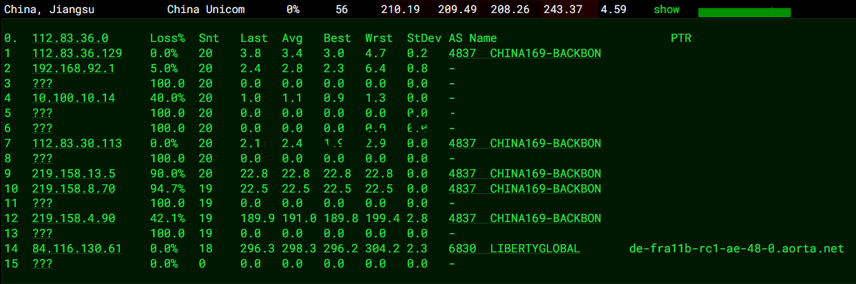 北京 电信 Datacamp -> 163 地理路径:英国 -> 法国 -> 天津 -> 北京 自治系统路径:AS202736 -> AS60068 -> AS4134 -> AS4847 1 0.35ms 82.39.*.* AS202736 英国 英格兰 伦敦 wisdomisp.com 2 0.33ms 79.127.*.* * 英国 英格兰 伦敦 3 1.10ms 185.156.*.* [CDN77-PEERLINKS] * 英国 英格兰 伦敦 4 6.90ms 185.229.*.* AS60068 [CDN77-c0r3] 法国 法兰西岛大区 巴黎 cdn77.com 5 7.41ms 79.127.*.* * 荷兰 北荷兰省 阿姆斯特丹 6 194.19ms 81.173.*.* AS4134 法国 法兰西岛大区 巴黎 chinatelecom.com.cn 7 164.17ms 202.97.*.* AS4134 [CHINANET-BB] 中国 天津 chinatelecom.com.cn 电信 8 190.30ms 202.97.*.* AS4134 [CHINANET-BB] 中国 北京 chinatelecom.com.cn 电信 9 188.42ms 202.97.*.* AS4134 [CHINANET-BB] 中国 上海 chinatelecom.com.cn 电信 12 160.78ms 219.141.*.* AS4847 [CHINATELECOM-BJ] 中国 北京 bj.189.cn 13 172.52ms 36.112.*.* AS4847 中国 北京 bj.189.cn 15 161.86ms 106.37.*.* AS4847 [CHINANET-HN] 中国 北京 bj.189.cn 北京 联通 AS201011 -> 4837 地理路径:英国 -> 德国 -> 北京 自治系统路径:AS202736 -> AS201011 -> AS4837 -> AS4808 1 0.36ms 82.39.*.* AS202736 英国 英格兰 伦敦 wisdomisp.com 2-3 0.41ms 79.127.*.* * 英国 英格兰 伦敦 4 13.68ms 5.56.*.* AS201011 德国 黑森 美因河畔法兰克福 core-backbone.com 5 15.41ms 80.81.*.* AS4837 [DE-CIX] 德国 黑森 DE-CIX Frankfurt - China Unicom - 100Gbps chinaunicom.cn 6-8 131.97ms 219.158.*.* AS4837 [CU169-BACKBONE] 中国 北京 chinaunicom.cn 9-10 139.15ms 124.65.*.* AS4808 [UNICOM-BJ] 中国 北京 www.bbn.com.cn 联通 14 150.55ms 221.222.*.* AS4808 [UNICOM-BJ] 中国 北京 海淀 www.bbn.com.cn 北京 移动 AS201011 -> CMI 地理路径:英国 -> 北京 自治系统路径:AS202736 -> AS201011 -> AS58453 -> AS9808 -> AS56048 1 0.32ms 82.39.*.* AS202736 英国 英格兰 伦敦 wisdomisp.com 2-3 0.48ms 79.127.*.* * 英国 英格兰 伦敦 4 1.34ms 80.255.*.* AS201011 英国 英格兰 伦敦 core-backbone.com 6 2.86ms 223.120.*.* AS58453 [CMI-INT] 英国 英格兰 伦敦 cmi.chinamobile.com 移动 7 243.46ms 223.120.*.* AS58453 [CMI-INT] 中国 北京 cmi.chinamobile.com 8-11 241.37ms 221.183.*.* AS9808 [CMNET] 中国 北京 X-I chinamobileltd.com 移动 13-15 252.41ms 211.136.*.* AS56048 [CMNET] 中国 北京 bj.10086.cn 移动 17 246.79ms 211.136.*.* AS56048 [CMNET] 中国 北京 bj.10086.cn 移动