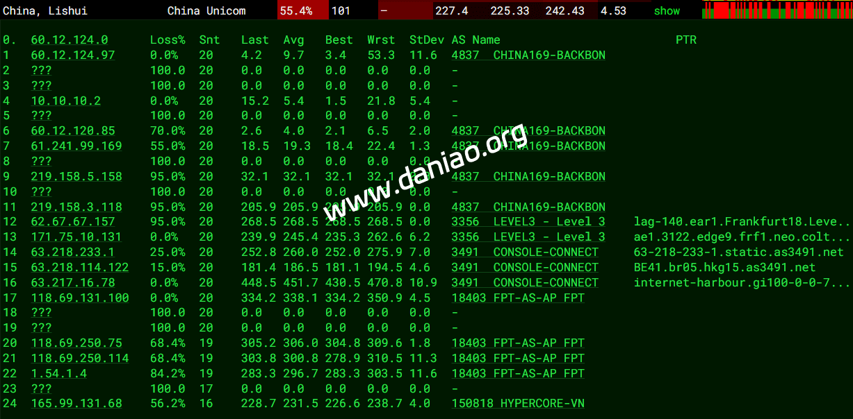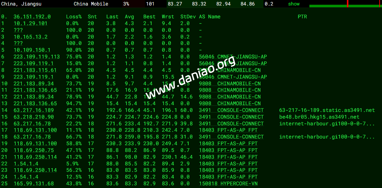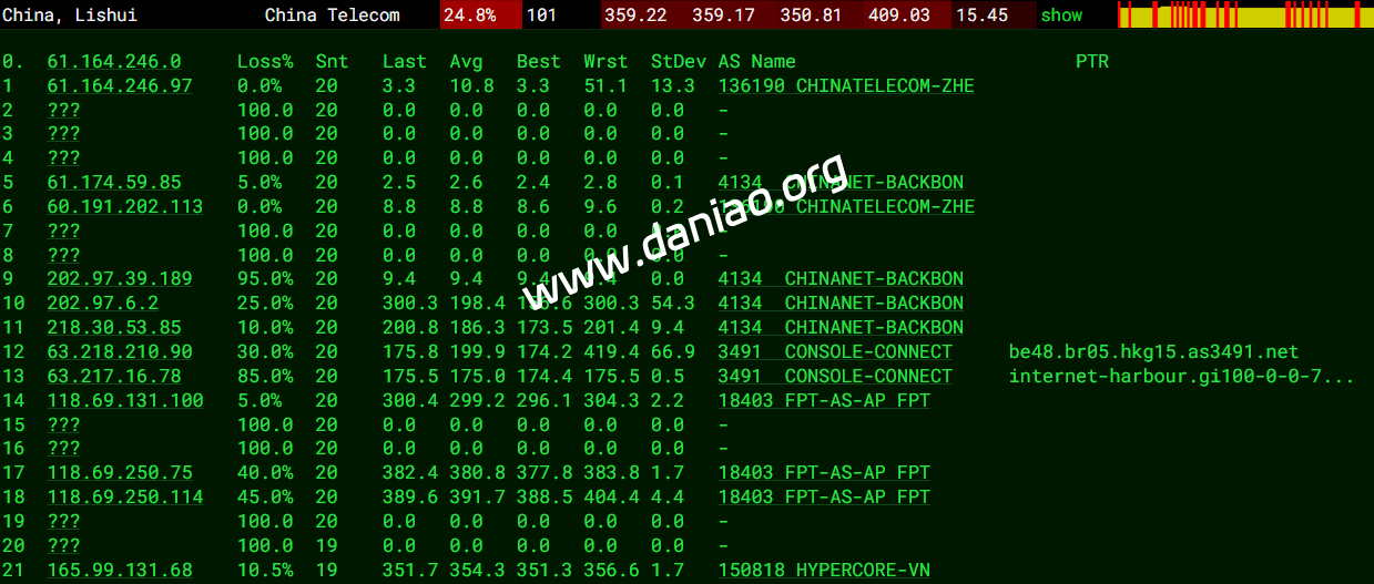 17-19  353.16ms  202.97.*.*   AS4134    [CHINANET-BB]     中国 北京 chinatelecom.com.cn 电信