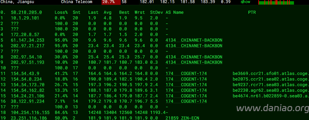 北京 电信 Arelion -> 163 地理路径:美国 -> 北京 自治系统路径:AS1299 -> AS4134 -> AS4847 3-4 0.33ms 104.254.*.* [ZL-LAX] * 美国 加利福尼亚州 钻石吧 5-6 0.80ms 62.115.*.* AS1299 [ARELION-NET] 美国 华盛顿 西雅图 arelion.com 7 35.73ms 62.115.*.* AS1299 [ARELION-NET] 美国 加利福尼亚 圣何塞 arelion.com 8-9 27.53ms 218.30.*.* AS4134 [CHINANET-US] 美国 加利福尼亚 圣何塞 Cogent/Telia-CT-PoP chinatelecom.com.cn 电信 10-12 158.41ms 202.97.*.* AS4134 [CHINANET-BB] 中国 北京 chinatelecom.com.cn 电信 13 162.84ms 219.141.*.* AS4847 [CHINATELECOM-BJ] 中国 北京 bj.189.cn 14 169.23ms 36.112.*.* AS4847 中国 北京 bj.189.cn 17 164.74ms 106.37.*.* AS4847 [CHINANET-HN] 中国 北京 bj.189.cn 上海 电信 Cogent -> 163 地理路径:美国 -> 上海 自治系统路径:AS1299 -> AS174 -> AS4134 -> AS174 -> AS4134 -> AS4812 -> AS4134 -> AS4812 3 0.26ms 104.254.*.* [ZL-LAX] * 美国 加利福尼亚 洛杉矶 4-6 2.97ms 62.115.*.* AS1299 [ARELION-NET] 美国 华盛顿 西雅图 arelion.com 7 1.64ms 154.54.*.* AS174 [COGENT-BONE] 美国 华盛顿 西雅图 cogentco.com 8-9 27.81ms 218.30.*.* AS4134 [CHINANET-US] 美国 加利福尼亚 圣何塞 Cogent/Telia-CT-PoP chinatelecom.com.cn 电信 10 30.02ms 38.104.*.* AS174 美国 加利福尼亚 圣克拉拉 cogentco.com 11 168.71ms 202.97.*.* AS4134 [CHINANET-BB] 中国 上海 chinatelecom.com.cn 电信 12 163.76ms 101.95.*.* AS4812 [CHINANET-SH] 中国 上海 chinatelecom.cn 18 159.29ms 101.226.*.* AS4812 [CHINANET-SH] 中国 上海市 chinatelecom.cn 电信 广东 电信 Cogent -> 163 地理路径:美国 -> 广东 自治系统路径:AS21859 -> AS1299 -> AS174 -> AS4134 3 0.74ms 23.236.*.* AS21859 美国 华盛顿州 西雅图 zenlayer.com 4-5 4.23ms 62.115.*.* AS1299 [ARELION-NET] 美国 华盛顿 西雅图 arelion.com 6-7 1.42ms 154.54.*.* AS174 [COGENT-BONE] 美国 华盛顿 西雅图 cogentco.com 8-9 22.79ms 218.30.*.* AS4134 [CHINANET-US] 美国 加利福尼亚 圣何塞 Cogent/Telia-CT-PoP chinatelecom.com.cn 电信 10-11 171.91ms 202.97.*.* AS4134 [CHINANET-BB] 中国 广东 广州 chinatelecom.com.cn 电信 13-14 175.44ms 113.96.*.* AS4134 [CHINANET-GD] 中国 广东 广州 chinatelecom.com.cn 电信 18 181.23ms 183.47.*.* AS4134 [APNIC-AP] 中国 广东省 广州市 chinatelecom.com.cn 电信
