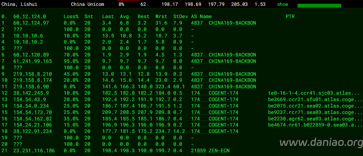 北京 联通 Arelion -> 4837 地理路径:美国 -> 德国 -> 北京 自治系统路径:AS1299 -> AS174 -> AS1299 -> AS174 -> AS1299 -> AS4837 -> AS4808 3 0.38ms 104.254.*.* [ZL-LAX] * 美国 加利福尼亚 洛杉矶 4-6 3.74ms 62.115.*.* AS1299 [ARELION-NET] 美国 华盛顿 西雅图 arelion.com 7 1.56ms 154.54.*.* AS174 [COGENT-BONE] 美国 华盛顿 西雅图 cogentco.com 8-9 18.08ms 154.54.*.* AS174 [COGENT-BONE] 美国 加利福尼亚 洛杉矶 cogentco.com 10 141.92ms 62.115.*.* AS1299 [ARELION-NET] 德国 黑森州 美因河畔法兰克福 arelion.com 11 187.10ms 38.88.*.* AS174 美国 加利福尼亚 洛杉矶 cogentco.com 13 183.23ms 219.158.*.* AS4837 [CU169-BACKBONE] 中国 北京 chinaunicom.cn 15 277.71ms 219.158.*.* AS4837 [CU169-BACKBONE] 中国 广东 广州 I-C chinaunicom.cn 联通 16 189.35ms 61.51.*.* AS4808 中国 北京市 延庆 www.bbn.com.cn 联通 18 276.97ms 125.33.*.* AS4808 [UNICOM-BJ] 中国 北京 通州 www.bbn.com.cn 19 283.56ms 61.149.*.* AS4808 [UNICOM-CN] 中国 北京 www.bbn.com.cn 上海 联通 Arelion -> 4837 地理路径:美国 -> 北京 -> 上海 自治系统路径:AS1299 -> AS4837 -> AS140979 3 0.17ms 104.254.*.* [ZL-LAX] * 美国 加利福尼亚 洛杉矶 4-5 2.85ms 62.115.*.* AS1299 [ARELION-NET] 美国 华盛顿 西雅图 arelion.com 6-9 34.56ms 62.115.*.* AS1299 [ARELION-NET] 美国 加利福尼亚 圣何塞 arelion.com 10 171.08ms 80.239.*.* AS1299 美国 加利福尼亚 洛杉矶 arelion.com 11-12 204.58ms 219.158.*.* AS4837 [CU169-BACKBONE] 中国 北京市 chinaunicom.cn 联通 20 215.60ms 112.64.*.* AS140979 [APNIC-AP] 中国 上海市 闵行 chinaunicom.cn 联通 广东 联通 Arelion -> 4837 地理路径:美国 -> 北京 -> 广东 自治系统路径:AS21859 -> AS1299 -> AS4837 -> AS136958 3 0.38ms 23.236.*.* AS21859 美国 华盛顿州 西雅图 zenlayer.com 4 55.61ms 104.254.*.* [ZL-LAX] * 美国 加利福尼亚 洛杉矶 5 2.47ms 62.115.*.* AS1299 [ARELION-NET] 美国 华盛顿 西雅图 arelion.com 6-8 34.33ms 62.115.*.* AS1299 [ARELION-NET] 美国 加利福尼亚 圣何塞 arelion.com 9-10 177.79ms 80.239.*.* AS1299 美国 加利福尼亚 洛杉矶 arelion.com 11-13 170.42ms 219.158.*.* AS4837 [CU169-BACKBONE] 中国 北京 chinaunicom.cn 联通 20 184.81ms 157.148.*.* AS136958 [UNICOM-GD] 中国 广东省 广州市 chinaunicom.cn 联通