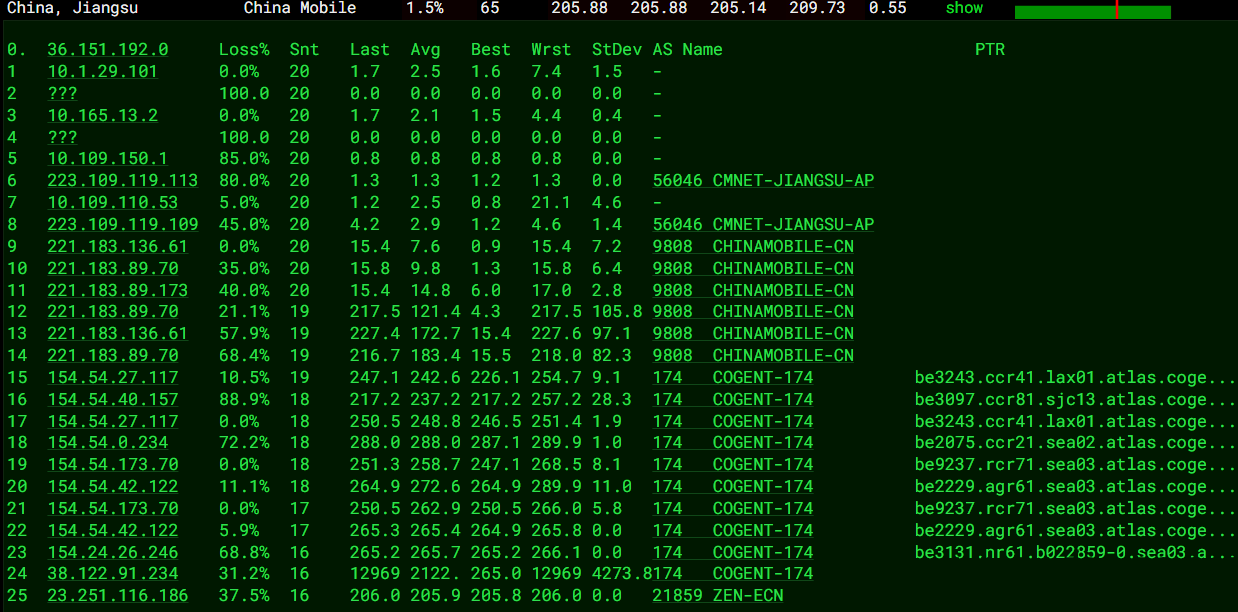 北京 移动 Arelion -> CMI 地理路径:美国 -> 北京 自治系统路径:AS21859 -> AS1299 -> AS58453 -> AS9808 -> AS56048 3 0.37ms 23.236.*.* AS21859 美国 华盛顿州 西雅图 zenlayer.com 4-6 3.04ms 62.115.*.* AS1299 [ARELION-NET] 美国 华盛顿 西雅图 arelion.com 7-9 28.01ms 62.115.*.* AS1299 [ARELION-NET] 美国 加利福尼亚 圣何塞 arelion.com 10 210.94ms 223.120.*.* AS58453 [CMI-INT] 中国 北京 cmi.chinamobile.com 移动 11-14 211.06ms 221.183.*.* AS9808 [CMNET] 中国 北京 X-I chinamobileltd.com 移动 15-18 238.20ms 211.136.*.* AS56048 [CMNET] 中国 北京 bj.10086.cn 移动 20 224.80ms 211.136.*.* AS56048 [CMNET] 中国 北京 bj.10086.cn 移动 上海 移动 Cogent -> CMI 地理路径:美国 -> 上海 自治系统路径:AS1299 -> AS58453 -> AS174 -> AS9808 -> AS174 -> AS58453 -> AS9808 3 0.36ms 104.254.*.* [ZL-LAX] * 美国 加利福尼亚 洛杉矶 4-6 2.12ms 62.115.*.* AS1299 [ARELION-NET] 美国 华盛顿 西雅图 arelion.com 7-8 19.26ms 223.120.*.* AS58453 [CMI-INT] 美国 华盛顿州 西雅图 cmi.chinamobile.com 移动 9 20.55ms 154.54.*.* AS174 [COGENT-BONE] 美国 加利福尼亚 圣何塞 cogentco.com 10 190.79ms 221.183.*.* AS9808 [CMNET] 中国 上海 X-I chinamobileltd.com 移动 12 30.46ms 38.104.*.* AS174 美国 加利福尼亚 洛杉矶 cogentco.com 13 30.14ms 223.120.*.* AS58453 [CMI-INT] 美国 加利福尼亚 洛杉矶 cmi.chinamobile.com 移动 14 244.78ms 223.120.*.* AS58453 [CMI-INT] 中国 上海 cmi.chinamobile.com 移动 18 202.24ms 117.185.*.* AS9808 [CMNET] 中国 上海市 chinamobileltd.com 移动 广东 移动 Arelion -> CMI 地理路径:美国 -> 广东 自治系统路径:AS1299 -> AS58453 -> AS9808 -> AS56040 3-4 0.23ms 104.254.*.* [ZL-LAX] * 美国 加利福尼亚州 钻石吧 5-7 0.79ms 62.115.*.* AS1299 [ARELION-NET] 美国 华盛顿 西雅图 arelion.com 8 19.33ms 223.120.*.* AS58453 [CMI-INT] 美国 华盛顿州 西雅图 cmi.chinamobile.com 移动 9 163.17ms 223.120.*.* AS58453 [CMI-INT] 中国 广东 广州 cmi.chinamobile.com 移动 10-13 163.76ms 221.183.*.* AS9808 [CMNET] 中国 广东 广州 X-I chinamobileltd.com 移动 14 193.26ms 211.136.*.* AS56040 [CMNET] 中国 广东 广州 gd.10086.cn 移动 15-17 208.07ms 183.235.*.* AS56040 [APNIC-AP] 中国 广东 广州 gd.10086.cn 移动 20 212.70ms 211.139.*.* AS56040 [CMNET] 中国 广东 广州 gd.10086.cn 移动