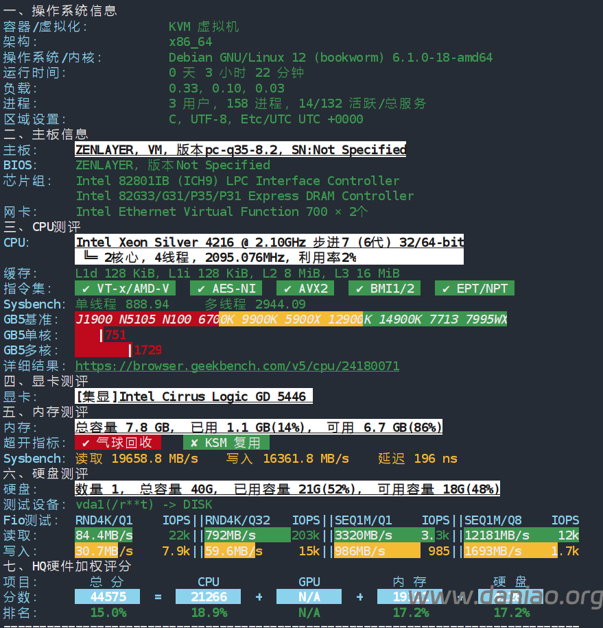 Xeon(R) Silver 4216 CPU @ 2.10GHz,磁盘IO:582.7 MB/s,不支持IPv6,上游是自己的机房:AS21859 Zenlayer Inc