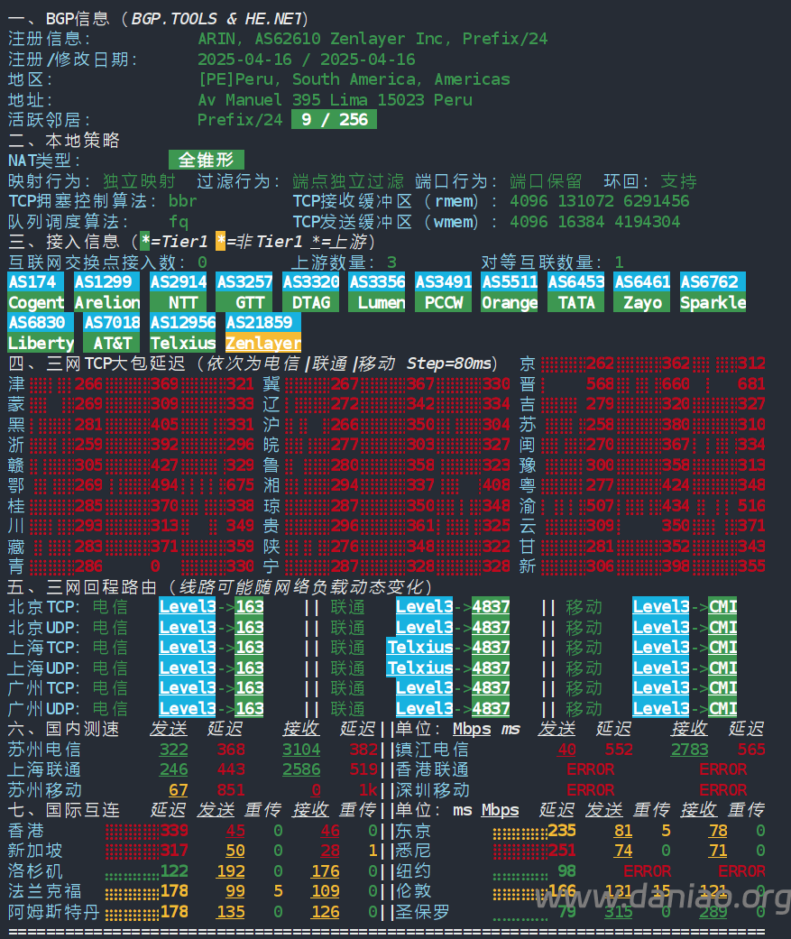 北京 电信 Level3 -> 163 地理路径:秘鲁 -> 美国 -> 北京 自治系统路径:AS3549 -> AS3356 -> AS4134 -> AS4847 2-5 0.32ms 10.11.*.* * RFC1918 6 0.86ms 190.216.*.* AS3549 [LACNIC-CIDR] 秘鲁 Vitarte lumen.com 7-8 125.07ms 4.69.*.* AS3356 美国 加利福尼亚 圣何塞 lumen.com 9-11 253.71ms 202.97.*.* AS4134 [CHINANET-BB] 中国 北京 chinatelecom.com.cn 电信 13 261.27ms 36.112.*.* AS4847 中国 北京 bj.189.cn 14-15 265.03ms 219.141.*.* AS4847 [CHINATELECOM-BJ] 中国 北京 bj.189.cn 16 265.45ms 106.37.*.* AS4847 [CHINANET-HN] 中国 北京 bj.189.cn 上海 电信 Level3 -> 163 地理路径:秘鲁 -> 美国 -> 上海 自治系统路径:AS3549 -> AS3356 -> AS4134 -> AS4812 2-5 0.25ms 10.11.*.* * RFC1918 6 11.67ms 190.216.*.* AS3549 [LACNIC-CIDR] 秘鲁 Vitarte lumen.com 7-8 117.51ms 4.69.*.* AS3356 美国 加利福尼亚 圣何塞 lumen.com 9-11 251.54ms 202.97.*.* AS4134 [CHINANET-BB] 中国 上海 X-I chinatelecom.com.cn 电信 18 263.38ms 101.226.*.* AS4812 [CHINANET-SH] 中国 上海市 chinatelecom.cn 电信 广东 电信 Level3 -> 163 地理路径:秘鲁 -> 美国 -> 广东 自治系统路径:AS21859 -> AS3549 -> AS3356 -> AS4134 2-4 0.26ms 10.11.*.* * RFC1918 5 0.57ms 128.1.*.* AS21859 秘鲁 卡亞俄 利马 zenlayer.com 6 0.95ms 190.216.*.* AS3549 [LACNIC-CIDR] 秘鲁 Vitarte lumen.com 7-8 121.12ms 4.69.*.* AS3356 美国 加利福尼亚 圣何塞 lumen.com 9-10 267.58ms 202.97.*.* AS4134 [CHINANET-BB] 中国 广东 广州 chinatelecom.com.cn 电信 18 282.16ms 183.47.*.* AS4134 [APNIC-AP] 中国 广东省 广州市 chinatelecom.com.cn 电信