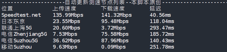 Node Name Upload Speed Download Speed Latency Speedtest.net 413.85 Mbps 398.10 Mbps 40.13 ms Los Angeles, US 364.36 Mbps 399.93 Mbps 3.47 ms Dallas, US 419.72 Mbps 401.07 Mbps 31.34 ms Montreal, CA 388.88 Mbps 402.51 Mbps 64.11 ms Paris, FR 359.82 Mbps 380.34 Mbps 137.71 ms Amsterdam, NL 314.75 Mbps 411.65 Mbps 150.41 ms Suzhou, CN 337.16 Mbps 409.34 Mbps 160.28 ms Ningbo, CN 17.63 Mbps 404.77 Mbps 150.44 ms Hong Kong, CN 3.06 Mbps 0.53 Mbps 168.76 ms Singapore, SG Test failed Taipei, CN 374.56 Mbps 414.63 Mbps 128.30 ms Tokyo, JP 369.46 Mbps 414.00 Mbps 113.53 ms ----------------------------------------------------------------------