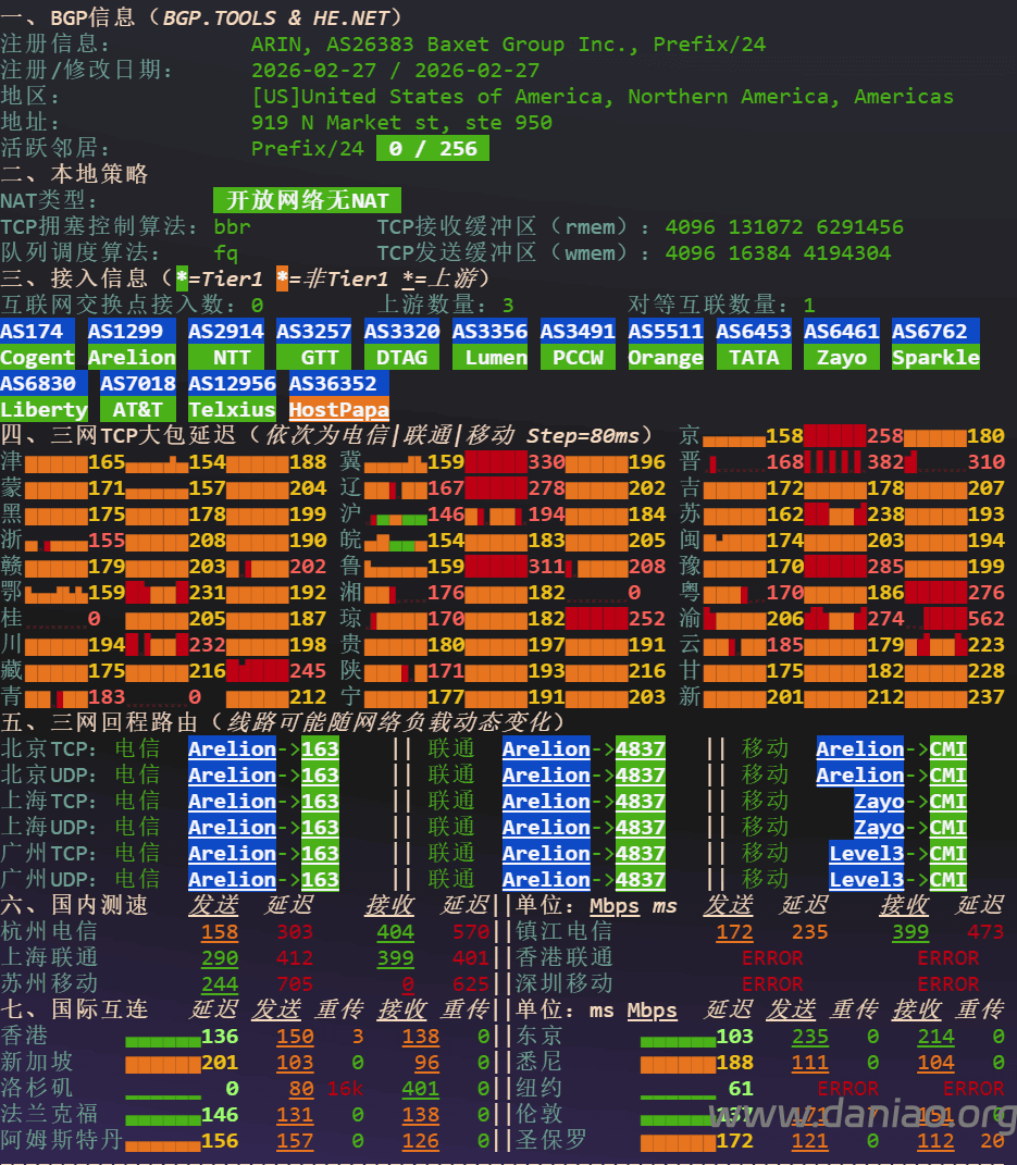 北京 电信 Arelion -> 163 地理路径:美国 -> 北京 自治系统路径:AS1299 -> AS4134 -> AS4847 2 0.61ms 10.9.*.* * RFC1918 3-7 0.40ms 62.115.*.* AS1299 [ARELION-NET] 美国 加利福尼亚 洛杉矶 arelion.com 8-9 158.24ms 202.97.*.* AS4134 [CHINANET-BB] 中国 北京 chinatelecom.com.cn 电信 11-13 160.09ms 219.141.*.* AS4847 [CHINATELECOM-BJ] 中国 北京 bj.189.cn 14 158.67ms 106.37.*.* AS4847 [CHINANET-HN] 中国 北京 bj.189.cn 上海 联通 Arelion -> 4837 地理路径:美国 -> 广东 -> 北京 -> 上海 自治系统路径:AS1299 -> AS4837 -> AS140979 2 0.43ms 10.9.*.* * RFC1918 3-5 0.42ms 62.115.*.* AS1299 [ARELION-NET] 美国 加利福尼亚 洛杉矶 arelion.com 6 17.26ms 80.239.*.* AS1299 美国 加利福尼亚 洛杉矶 arelion.com 7 188.77ms 219.158.*.* AS4837 [CU169-BACKBONE] 中国 广东省 广州市 chinaunicom.cn 8 191.53ms 219.158.*.* AS4837 [CU169-BACKBONE] 中国 北京 chinaunicom.cn 联通 17 192.67ms 58.246.*.* AS140979 中国 上海市 chinaunicom.cn 联通 广东 电信 Arelion -> 163 地理路径:美国 -> 广东 自治系统路径:AS1299 -> AS4134 2 0.51ms 10.9.*.* * RFC1918 3-6 0.86ms 62.115.*.* AS1299 [ARELION-NET] 美国 加利福尼亚 洛杉矶 arelion.com 7-8 14.24ms 218.30.*.* AS4134 [CHINANET-US] 美国 加利福尼亚 圣何塞 Cogent/Telia-CT-PoP chinatelecom.com.cn 电信 9-10 165.68ms 202.97.*.* AS4134 [CHINANET-BB] 中国 广东 广州 chinatelecom.com.cn 11 172.21ms 113.96.*.* AS4134 [CHINANET-GD] 中国 广东 广州 chinatelecom.com.cn 电信 13 165.48ms 14.18.*.* AS4134 中国 广东 广州 chinatelecom.com.cn 电信 17 178.07ms 183.47.*.* AS4134 [APNIC-AP] 中国 广东省 广州市 chinatelecom.com.cn 电