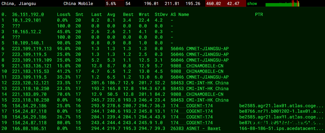 北京 移动 Arelion -> CMI 地理路径:美国 -> 北京 自治系统路径:AS1299 -> AS58453 -> AS9808 -> AS56048 2 10.59ms 10.9.*.* * RFC1918 3-6 0.41ms 62.115.*.* AS1299 [ARELION-NET] 美国 加利福尼亚 洛杉矶 arelion.com 7-8 0.95ms 223.120.*.* AS58453 [CMI-INT] 美国 加利福尼亚 洛杉矶 cmi.chinamobile.com 移动 9-10 175.44ms 221.183.*.* AS9808 [CMNET] 中国 北京 X-I chinamobileltd.com 移动 14-16 188.16ms 211.136.*.* AS56048 [CMNET] 中国 北京 bj.10086.cn 移动 18 178.92ms 211.136.*.* AS56048 [CMNET] 中国 北京 bj.10086.cn 移动 上海 移动 Zayo -> CMI 地理路径:美国 -> 上海 自治系统路径:AS46887 -> AS6461 -> AS58453 -> AS9808 2 0.45ms 10.9.*.* * RFC1918 3-5 0.69ms 160.72.*.* AS46887 美国 加利福尼亚州 洛杉矶 crowncastle.com 7 1.03ms 64.125.*.* AS6461 美国 加利福尼亚 洛杉矶 zayo.com 9 1.50ms 208.184.*.* AS6461 [ABOVENET-6] 美国 加利福尼亚 洛杉矶 zayo.com 10 1.30ms 223.120.*.* AS58453 [CMI-INT] 美国 加利福尼亚 洛杉矶 cmi.chinamobile.com 移动 12-16 186.75ms 221.183.*.* AS9808 [CMNET] 中国 上海 X-I chinamobileltd.com 移动 17 182.77ms 117.185.*.* AS9808 [CMNET] 中国 上海市 chinamobileltd.com 移动 广东 移动 Level3 -> CMI 地理路径:美国 -> 德国 -> 广东 自治系统路径:AS46887 -> AS3356 -> AS58453 -> AS9808 -> AS56040 2 0.53ms 10.9.*.* * RFC1918 3-5 0.82ms 160.72.*.* AS46887 美国 加利福尼亚州 洛杉矶 crowncastle.com 8 148.12ms 4.68.*.* AS3356 德国 黑森 美因河畔法兰克福 lumen.com 9 152.12ms 223.120.*.* AS58453 [CMI-INT] 德国 黑森 美茵河畔法兰克福 cmi.chinamobile.com 移动 10-13 260.11ms 221.183.*.* AS9808 [CMNET] 中国 广东 广州 X-I chinamobileltd.com 移动 14-16 262.99ms 183.235.*.* AS56040 [APNIC-AP] 中国 广东 广州 gd.10086.cn 移动 20 263.28ms 211.139.*.* AS56040 [CMNET] 中国 广东 广州 gd.10086.cn 移动