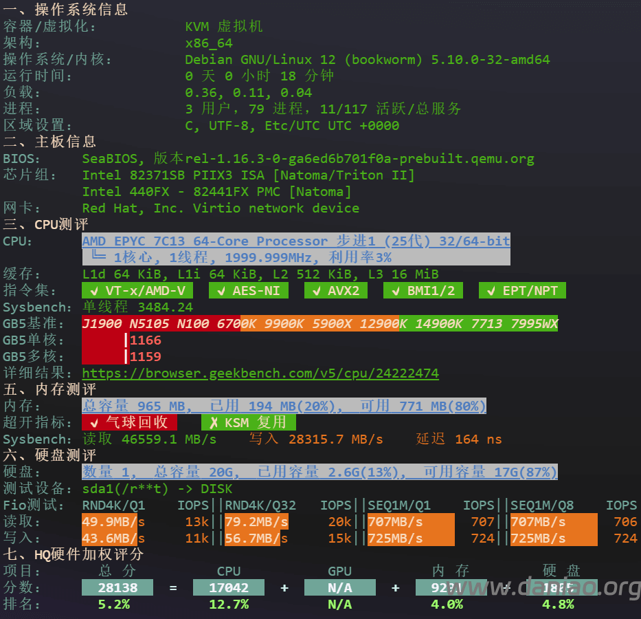 CPU Model : AMD EPYC 7C13 64-Core Processor CPU Cores : 1 @ 1999.999 MHz CPU Cache : 512 KB AES-NI : ✓ Enabled VM-x/AMD-V : ✓ Enabled Total Disk : 19.7 GB (1.3 GB Used) Total RAM : 964.5 MB (67.9 MB Used) System Uptime : 0 days, 1 hour 28 min Load Average : 0.00, 0.04, 0.00 OS : Debian GNU/Linux 11 (bullseye) Arch : x86_64 (64 Bit) Kernel : 5.10.0-32-amd64 TCP Congestion Ctrl: bbr Virtualization : KVM IPv4/IPv6 : ✓ Online / ✗ Offline Organization : AS26383 Baxet Group Inc. Location : Los Angeles / US Region : California ---------------------------------------------------------------------- I/O Speed(1st run) : 683 MB/s I/O Speed(2nd run) : 715 MB/s I/O Speed(3rd run) : 704 MB/s I/O Speed(average) : 700.7 MB/s ----------------------------------------------------------------------